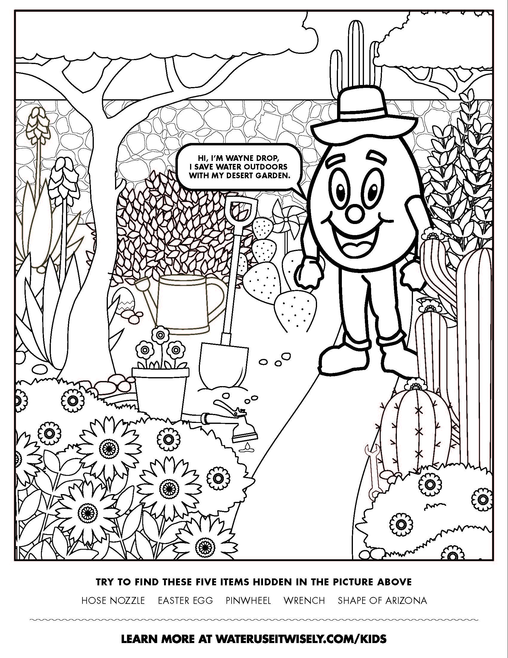 I had a vision of me standing in my perfectly landscaped desert garden. There were desert trees and plants and flowers to color in. I saw secret objects in the garden to be discovered. There was a quiz with water-saving tips and a water-saving word search.